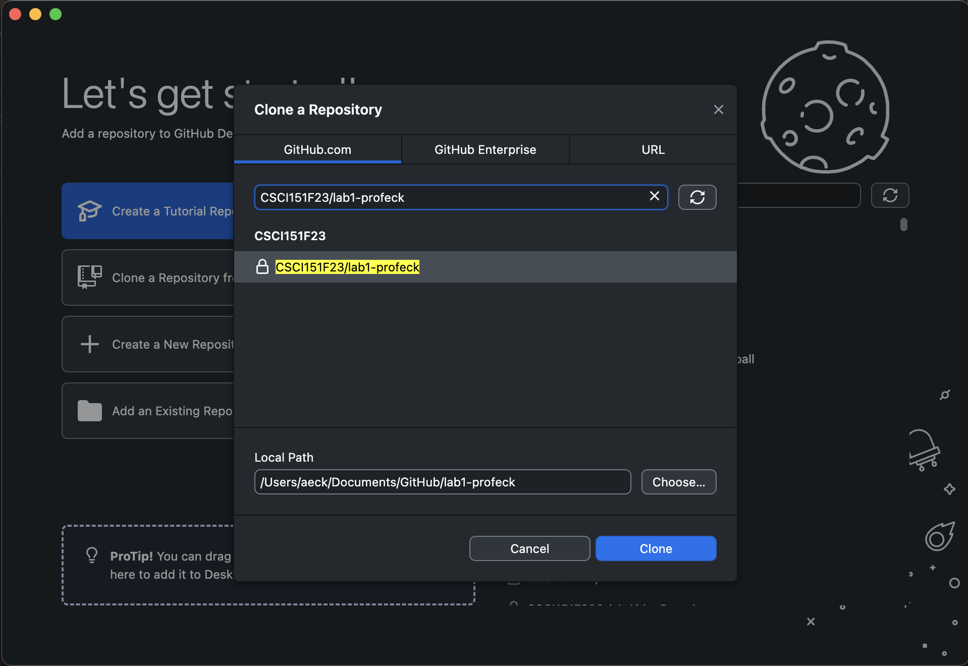 In the window that pops up, lookup your respository for the current lab by searching for "CSCI151F23/lab#-XXX", where "#" is the lab number and "XXX" is your GitHub username. Click on the repository when it appears under the search box. Remember the folder name under "Local Path" at the bottom of the Window -- this is where your code will be downloaded to. Finally, click the "Clone" button. You will need to do this with each lab that you want to work on using your own computer