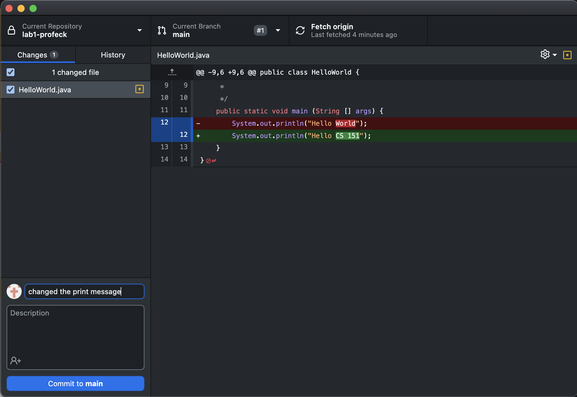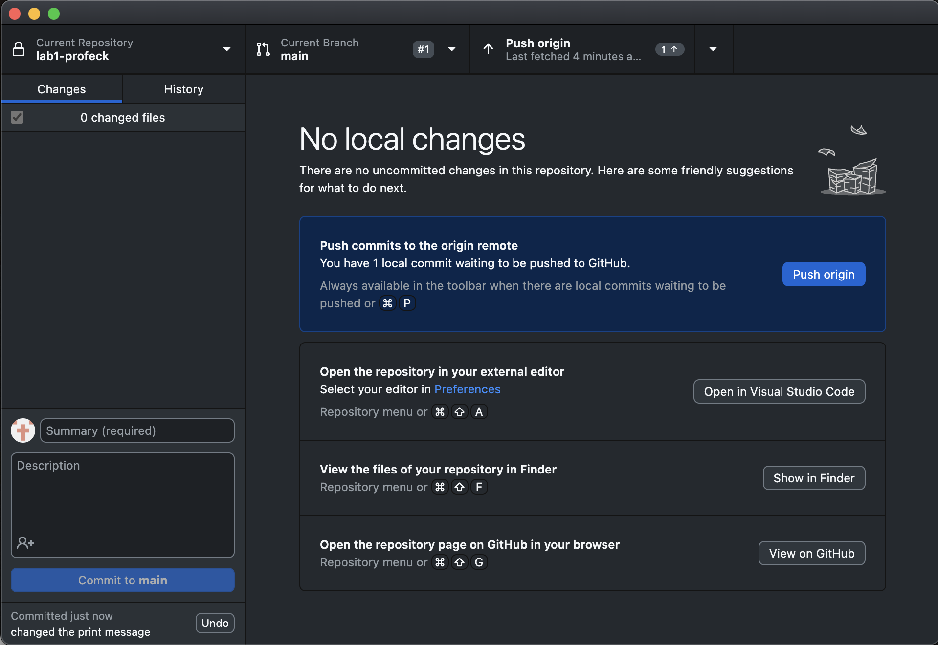 Finally, you can perform the equivalent of a "git push" command by clicking on the "Push origin" button in the top middle of the application. Note: this button is only available if you have recently pushed the "Commit to main" button to commit your changes.