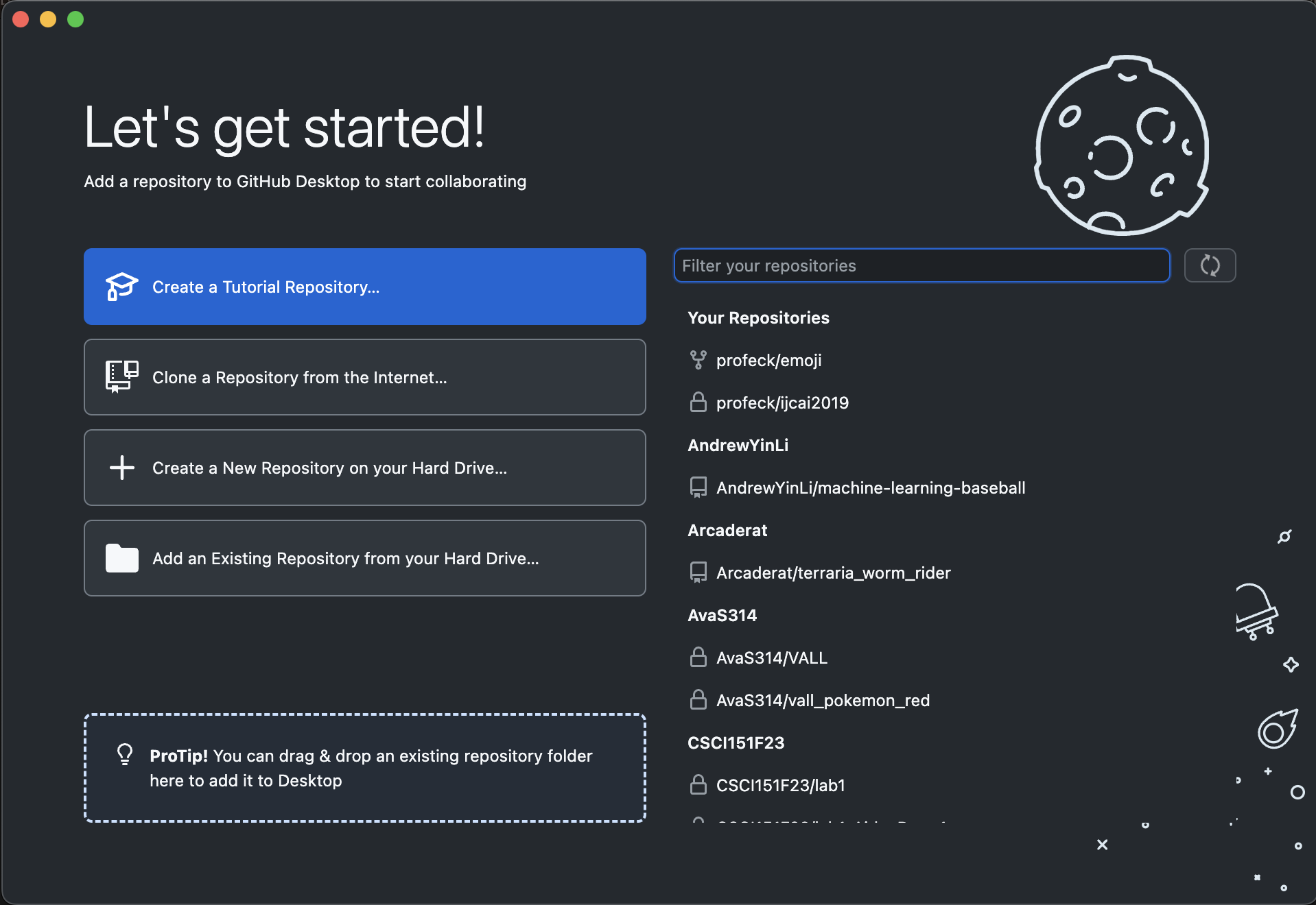 To clone a repository to your computer, either click the "Clone a Repository from the internet" button on the first screen of the application, or go to the "File" menu and choose the "Clone Repository option".