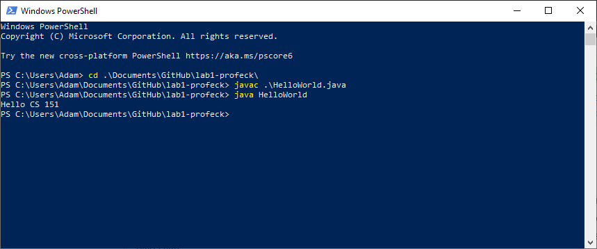 On Windows, there is an equivalent program called Powershell that you can load by searching for it in the Start Menu. In Powershell, you can use the same cd, javac, and java commands to change your directory to whereever you cloned your GitHub repository (described above), compile your programs, and run your programs, respectively.
