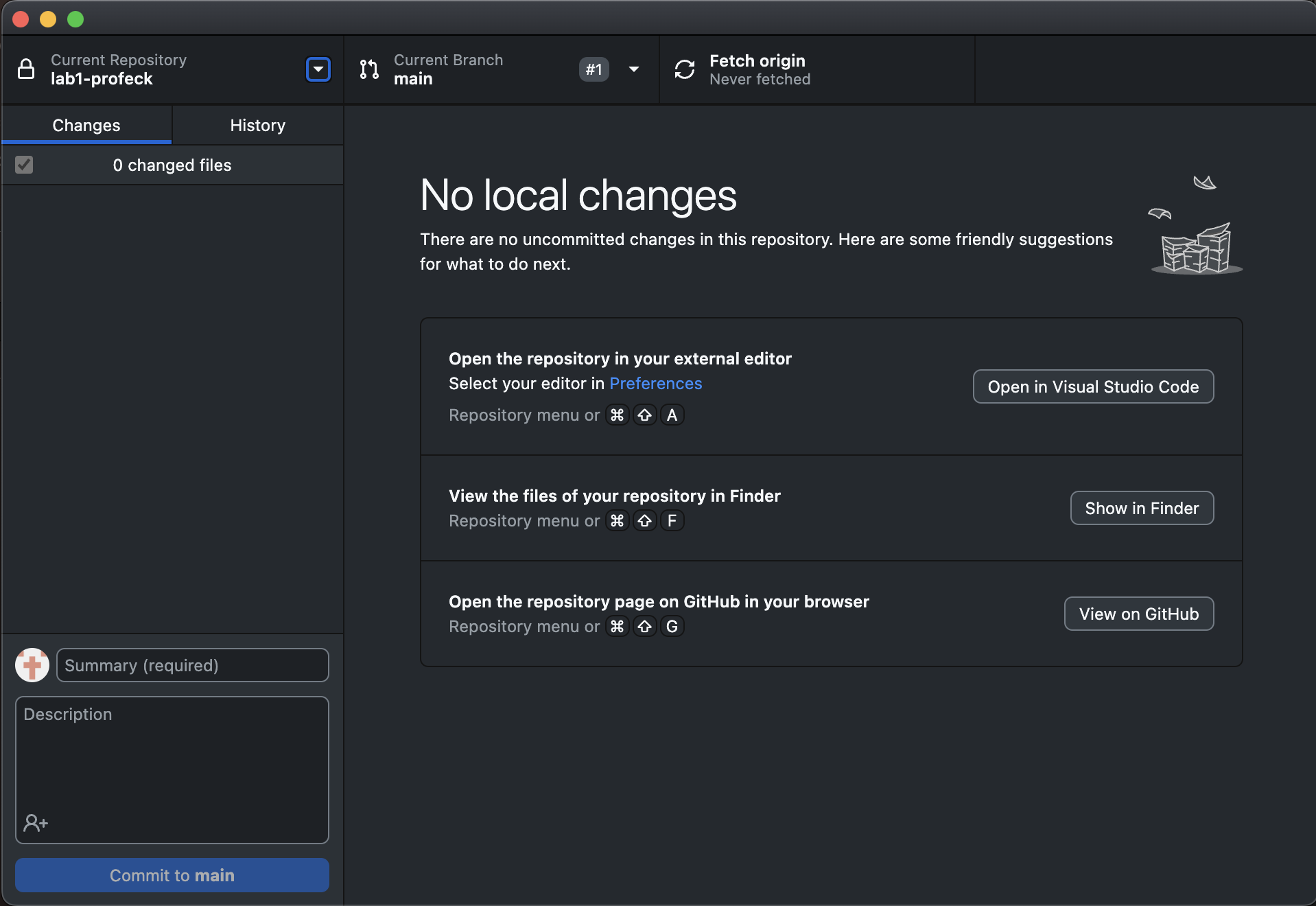 Next, you should see a screen like the following. There are several important parts here. The left top shows all of the files you have edited since you last committed your changes (this should start empty). When you have changes to commit, you can perform the equivalent of a "git add" command by simply checking the files you want to include. In the bottom left, you can create a commit message by filling in the textbox to the right of your user image (where it says "Summary (required)", then you can perform the equivalent of a "git commit -m" command by pushing the "Commit to main" button at the bottom.