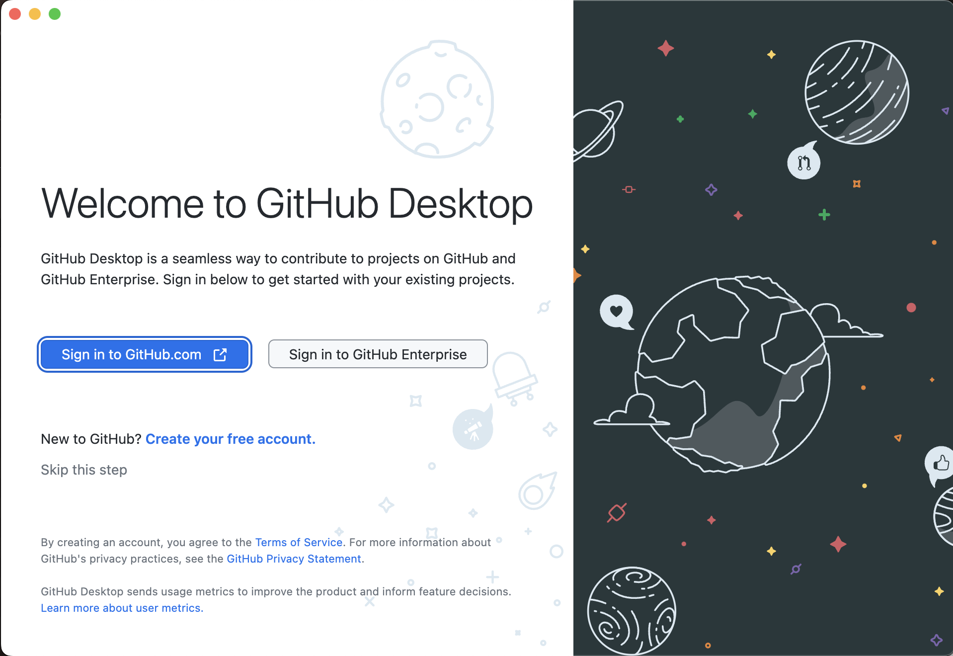 Once you have installed GitHub Desktop, the first step you need to do is login to your GitHub account. You will only need to do this once. You can do this by pressing the "Sign in to GitHub.com" button. Follow the directions in your browser, similar to what we did in the Warmup for Lab 1. Back in GitHub Desktop, keep the "Use my GitHub account name and email address" radio button checked, then click the Finish button.