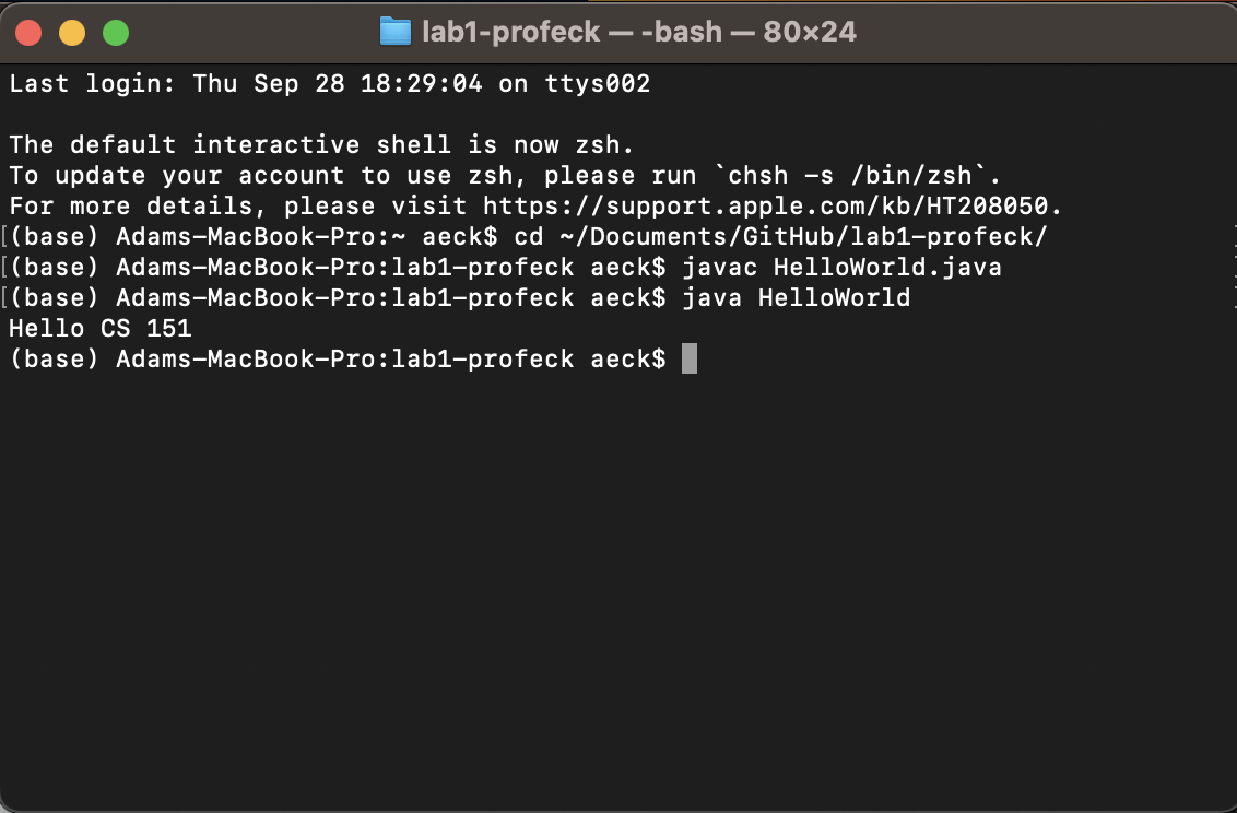 On macOS, there is an equivalent program called Terminal that you can load by holding down the Command key and pressing the Spacebar to bring up "Spotlight Search", then typing in "Terminal" and running the Terminal application. In Terminal, you can use the same cd, javac, and java commands to change your directory to whereever you cloned your GitHub repository (described above), compile your programs, and run your programs, respectively.